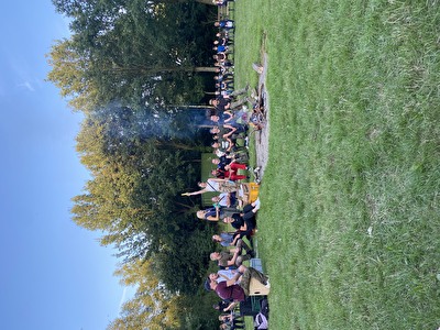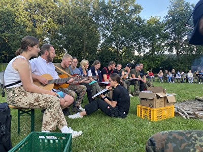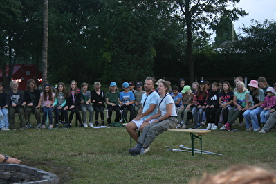 Nachdem die Kinder dann die Zelte bezogen haben, zum Mittag gegessen haben und am Nachmittag die Dorfralley auf dem Programm stand, treffen wir uns gleich am Lagerfeuer.